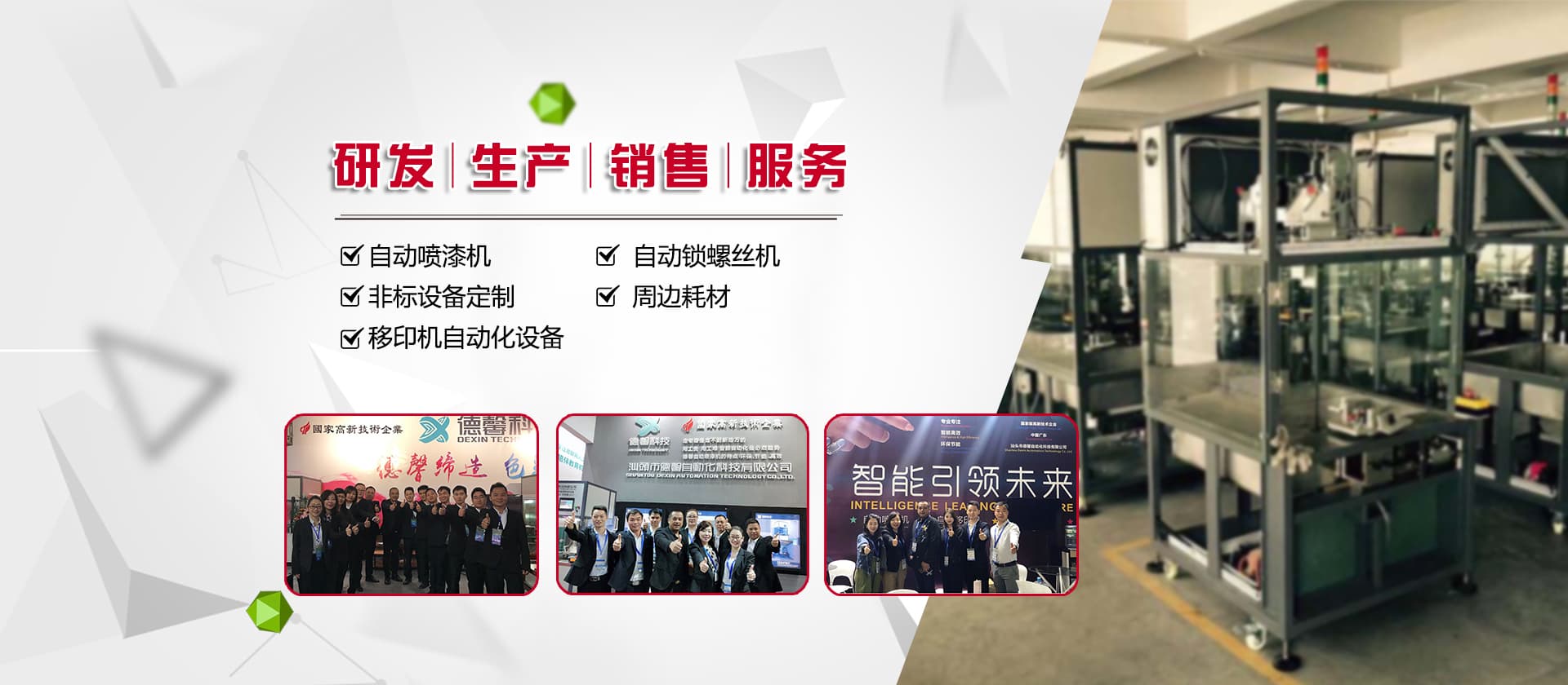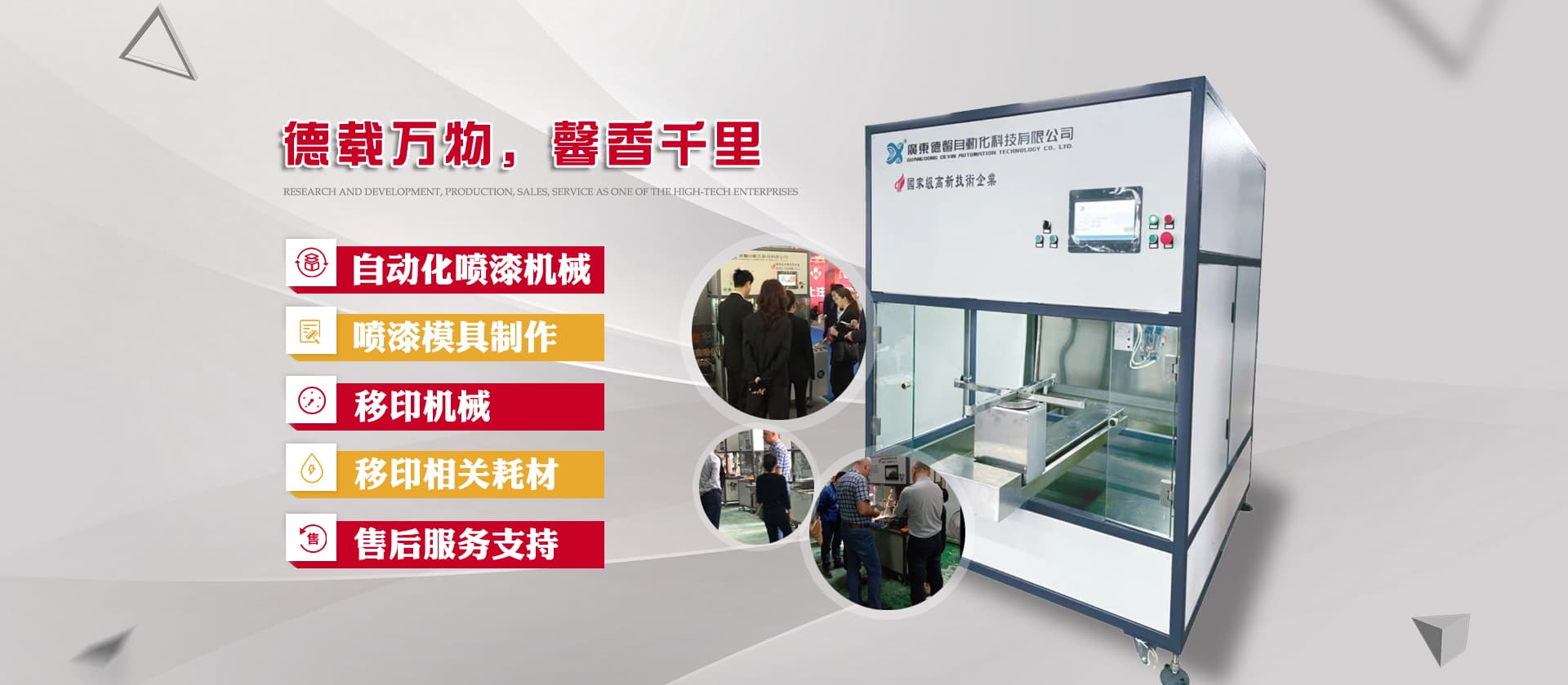 德馨科技創(chuàng)立以來(lái),以改變噴印業(yè)傳統(tǒng)手工生產(chǎn)模式為目標(biāo),產(chǎn)品開(kāi)發(fā)制造堅(jiān)持以“環(huán)保、智能”為理念,為企業(yè)的生產(chǎn)環(huán)境、人力成本、生產(chǎn)效率等提供更為優(yōu)良的服務(wù)和技術(shù)支持。公司研發(fā)產(chǎn)品主要有自動(dòng)化噴漆機(jī)械、噴漆模具制作等;生產(chǎn)銷(xiāo)售移印機(jī)械及移印相關(guān)耗材,包括菲林設(shè)計(jì)輸出;鋼板制作、移印膠頭制作、定位制作及周邊配件耗材并提供完善的售后服務(wù)支持。